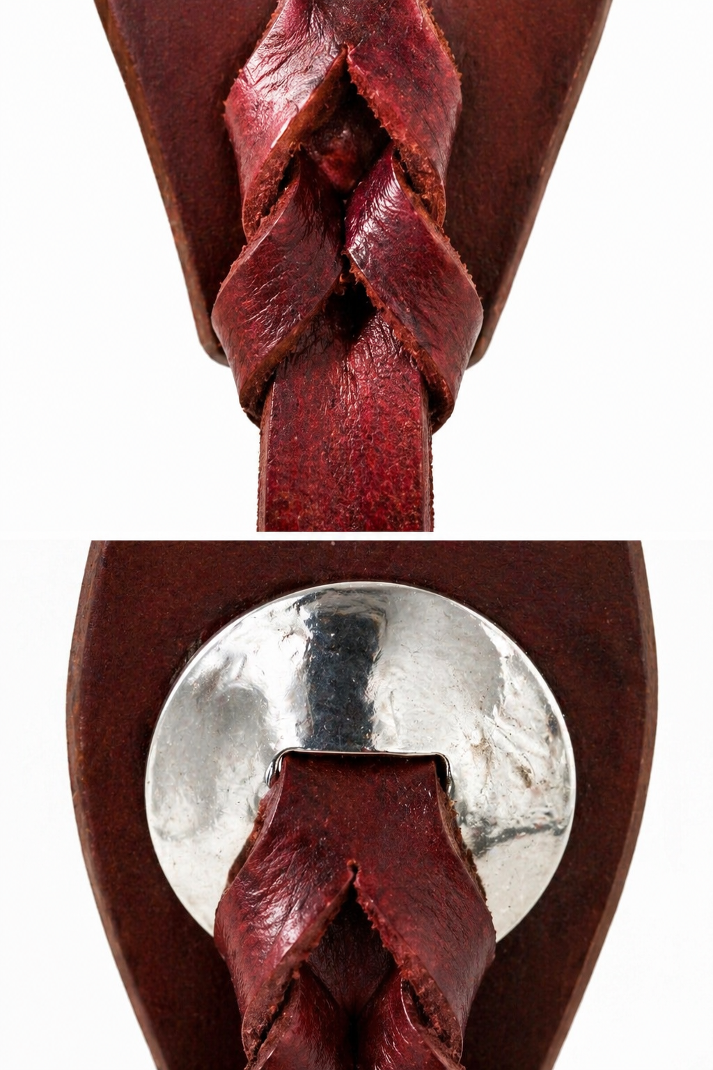 Jednouška s proplétaným ouškem, barva chocolate brown, vyrobena z extra jemné kůže, nerezové US kování.
