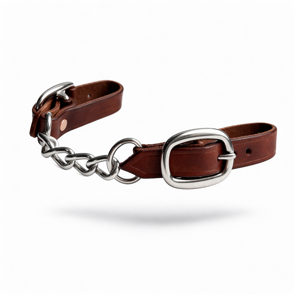 Podbradní řemínek vyrobený z měkké kůže, s nerezovými přezkami a řetízkem.