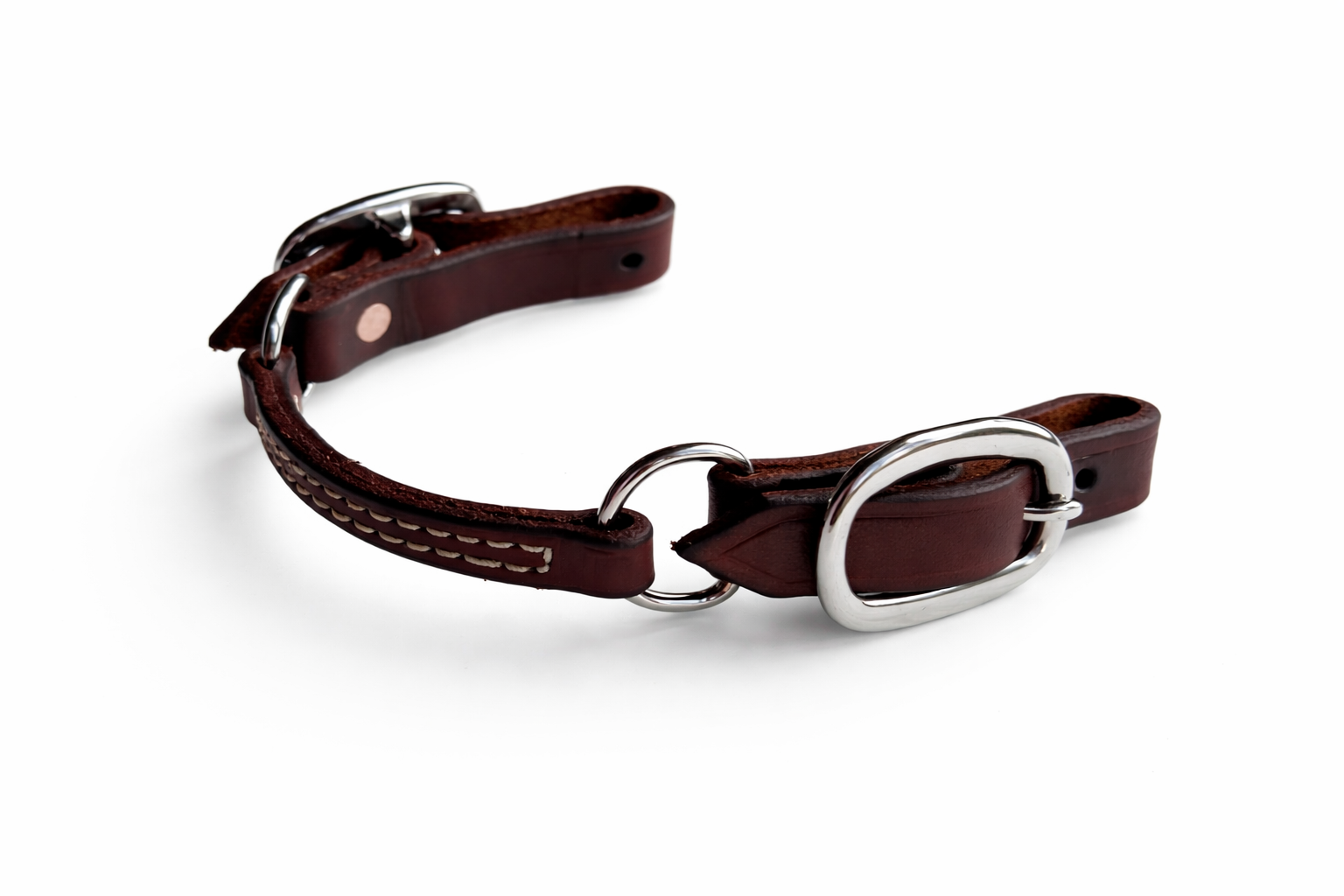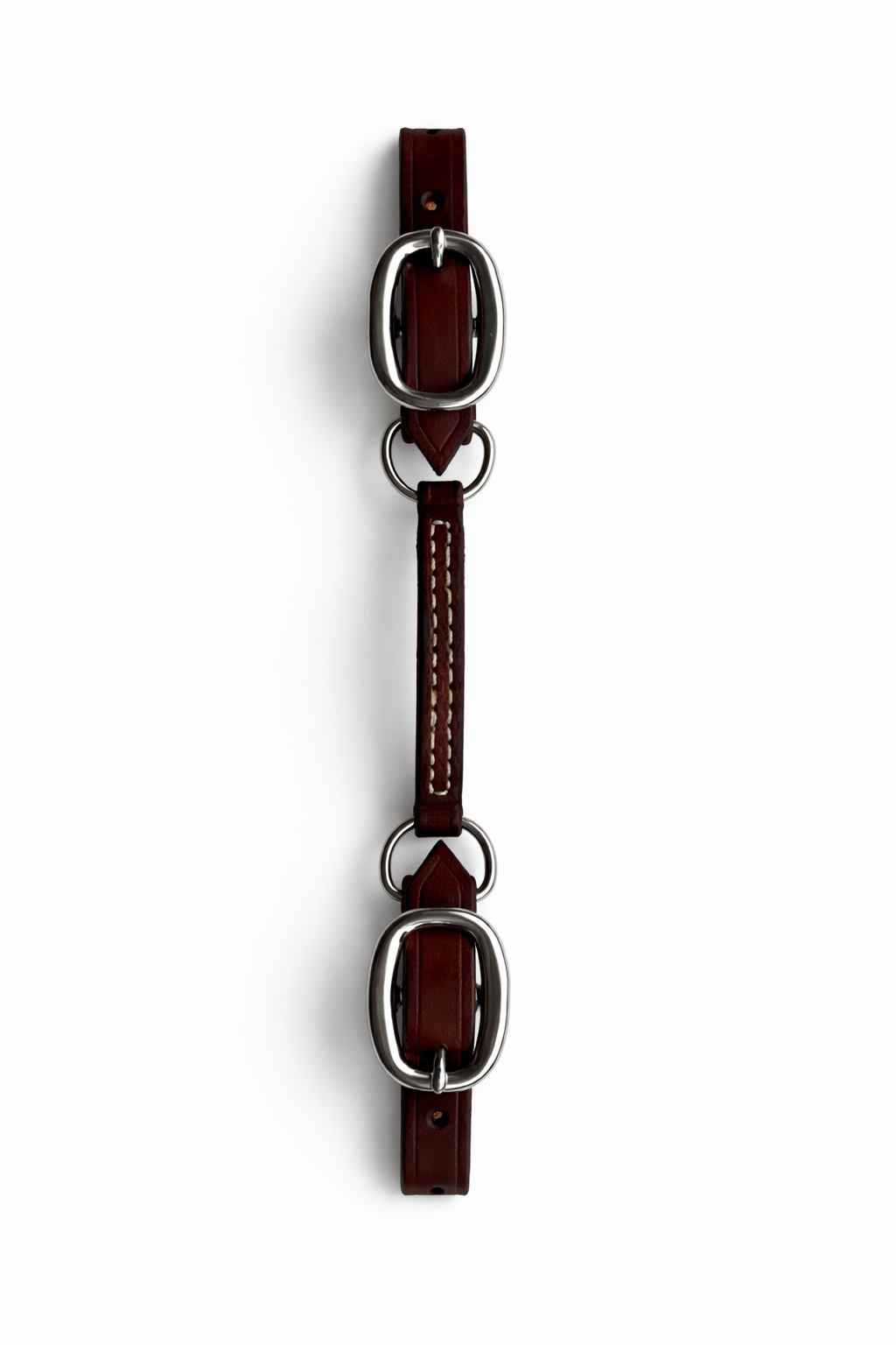 Podbradní řemínek vyrobený z kvalitní kůže, prošívaný, nerezové přezky a kování.