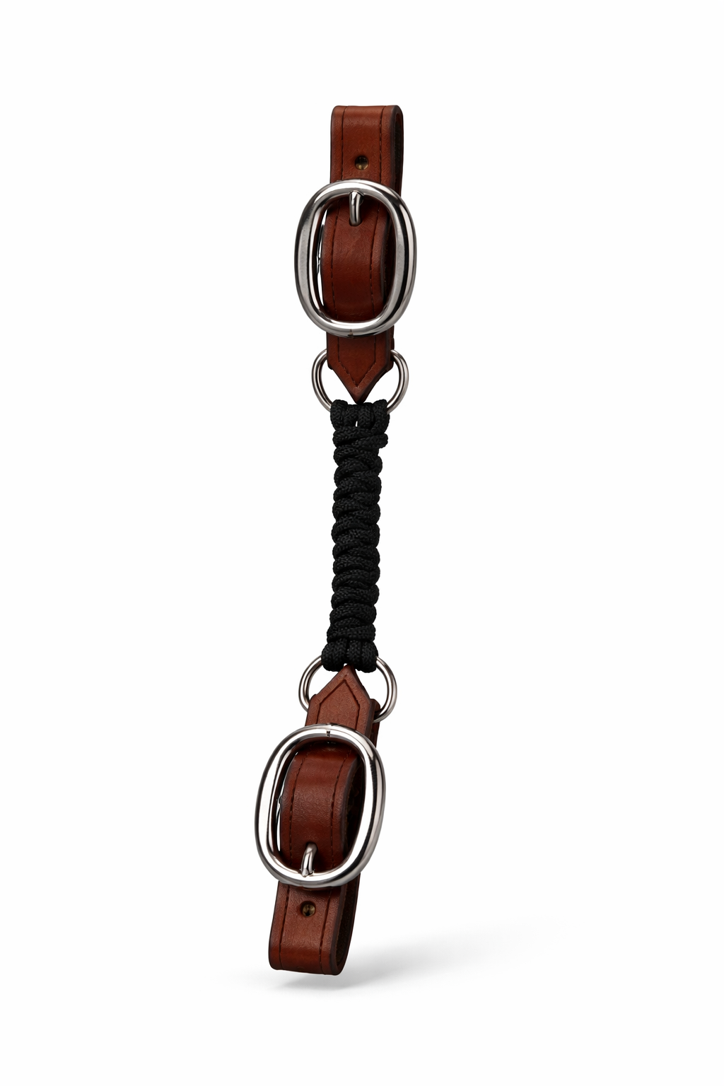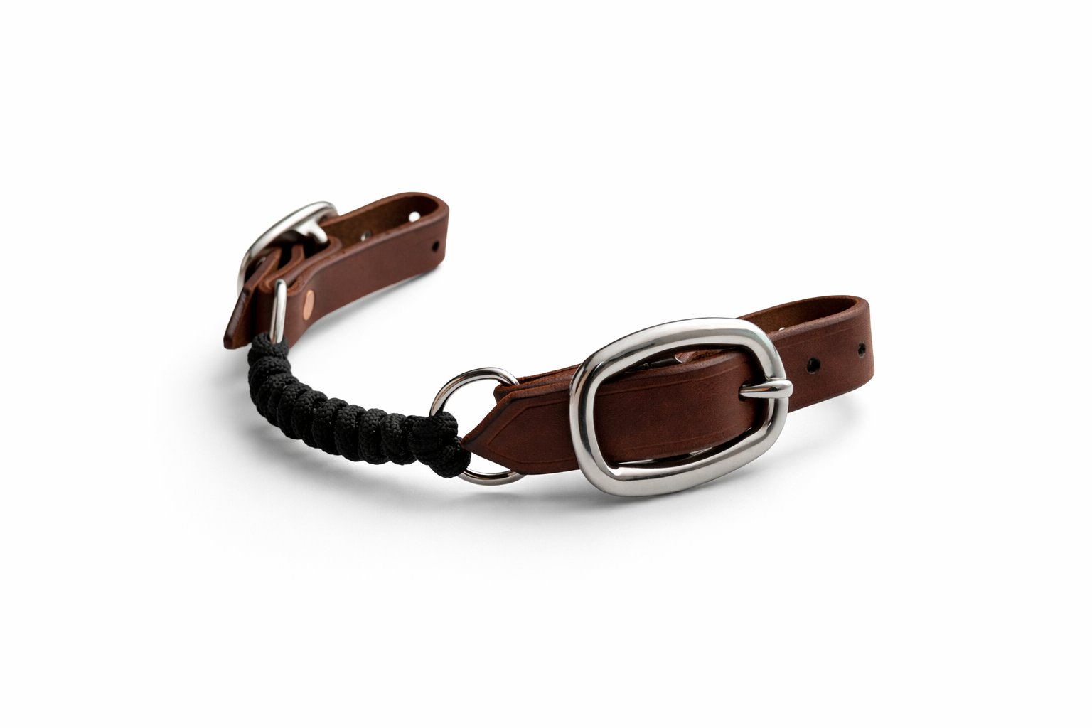 Podbradní řemínek Vyrobený z měkké kůže, s nerezovým kováním a zaplétaným paracordem.